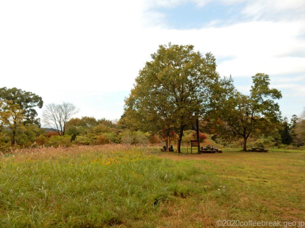 さらに少し進むとぱっと開けて「ほほえみの丘」。気持ちのいいところです。ベンチとテーブルもあるので、ここでお弁当を広げるのも良さそう。