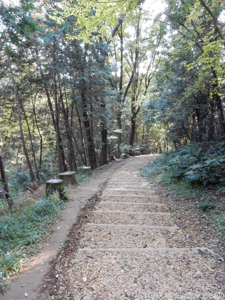 まずショッピングモールのスーパーマーケットでおやつや飲み物をゲット。中山西交差点のそばの奥武蔵自然歩道の入口から宮沢湖へ出発。少し進むと道が二手に分かれます。今回は高麗峠経由で行くので左へ折れて緩い坂をのぼっていきます。