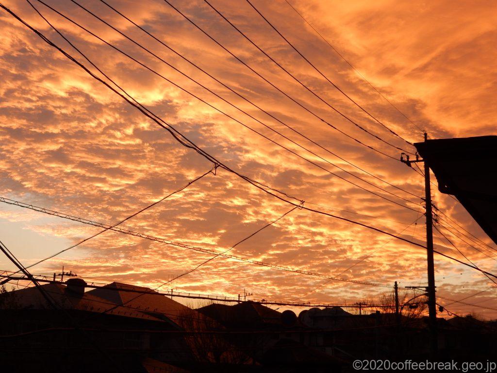慌てて2階のベランダへ走りました。電線だの屋根だのに遮られてはいましたが、それでも焼けたように真っ赤で大きな空が、覆いかぶさってくるようでした。