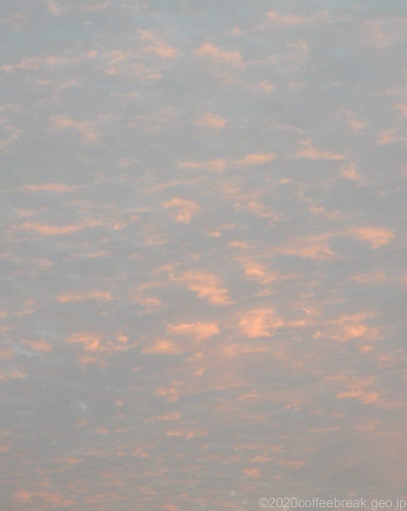 東を振り返ると、まだ青みの残った空にオレンジがかった綿毛のような雲がふわっふわっと漂っていました。西側の空とは正反対の優し気な表情。