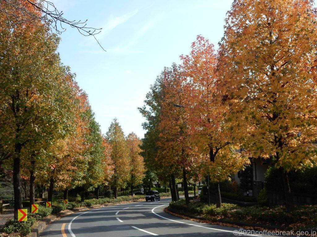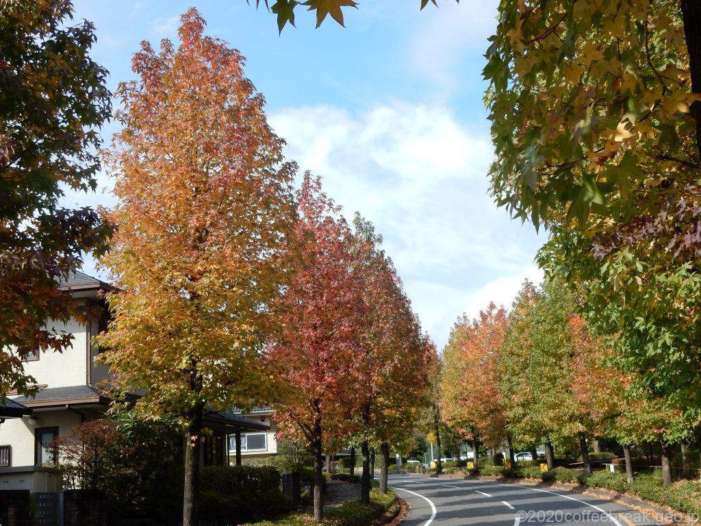 我が家の近くにモミジバフウの並木道があります。現在、紅葉進行中。